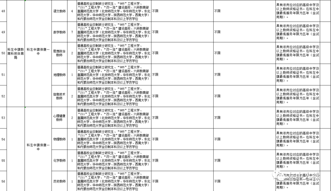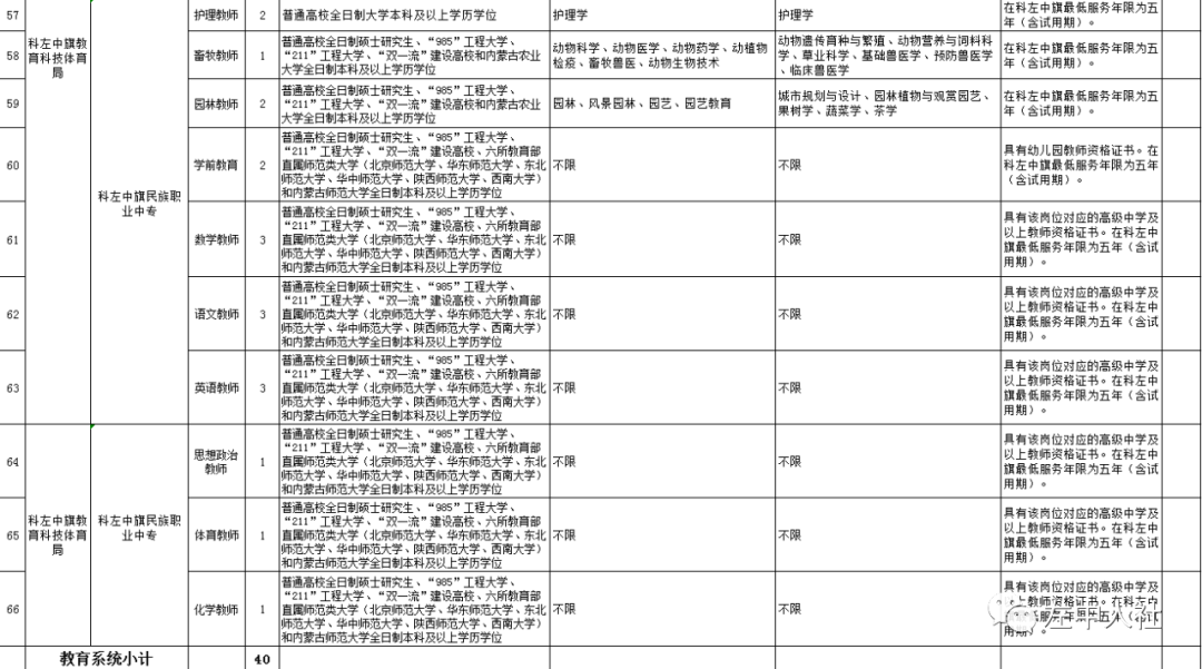 (2)旗實驗高中護(hù)理教師崗位要求普通高校全日制大學(xué)本科及以上學(xué)歷學(xué)位;畜牧教師崗位、園林教師崗位要求普通高校全日制碩士研究生、“985”工程大學(xué)、“211”工程大學(xué)、“雙一流”建設(shè)高校、內(nèi)蒙古農(nóng)業(yè)大學(xué)全日制本科及以上學(xué)歷學(xué)位。