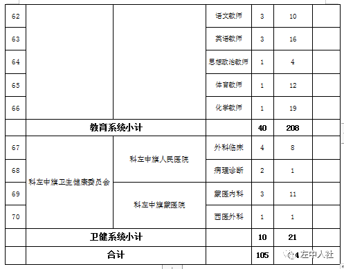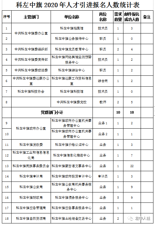 截止2020年7月6日17:30時,經(jīng)科左中旗2020年人才引進工作領(lǐng)導小組辦公室統(tǒng)計,科左中旗2020年人才引進報名成功414人,有10個崗位無人報名,請報名人員在規(guī)定時間內(nèi)選擇適合自己的崗位進行報考。