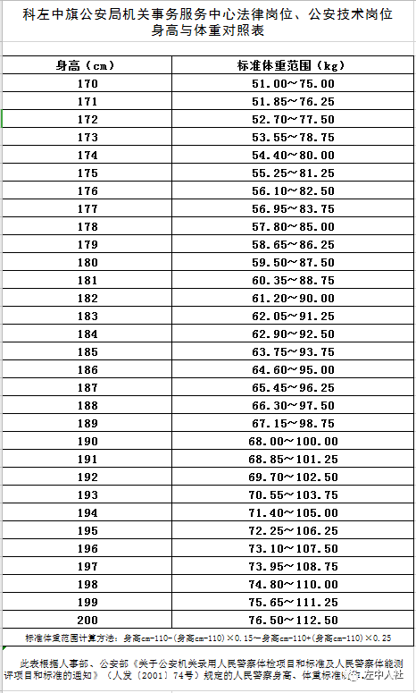 附件2:科左中旗公安局機關(guān)事務(wù)服務(wù)中心法律崗位、公安技術(shù)崗位身高與體重對照表