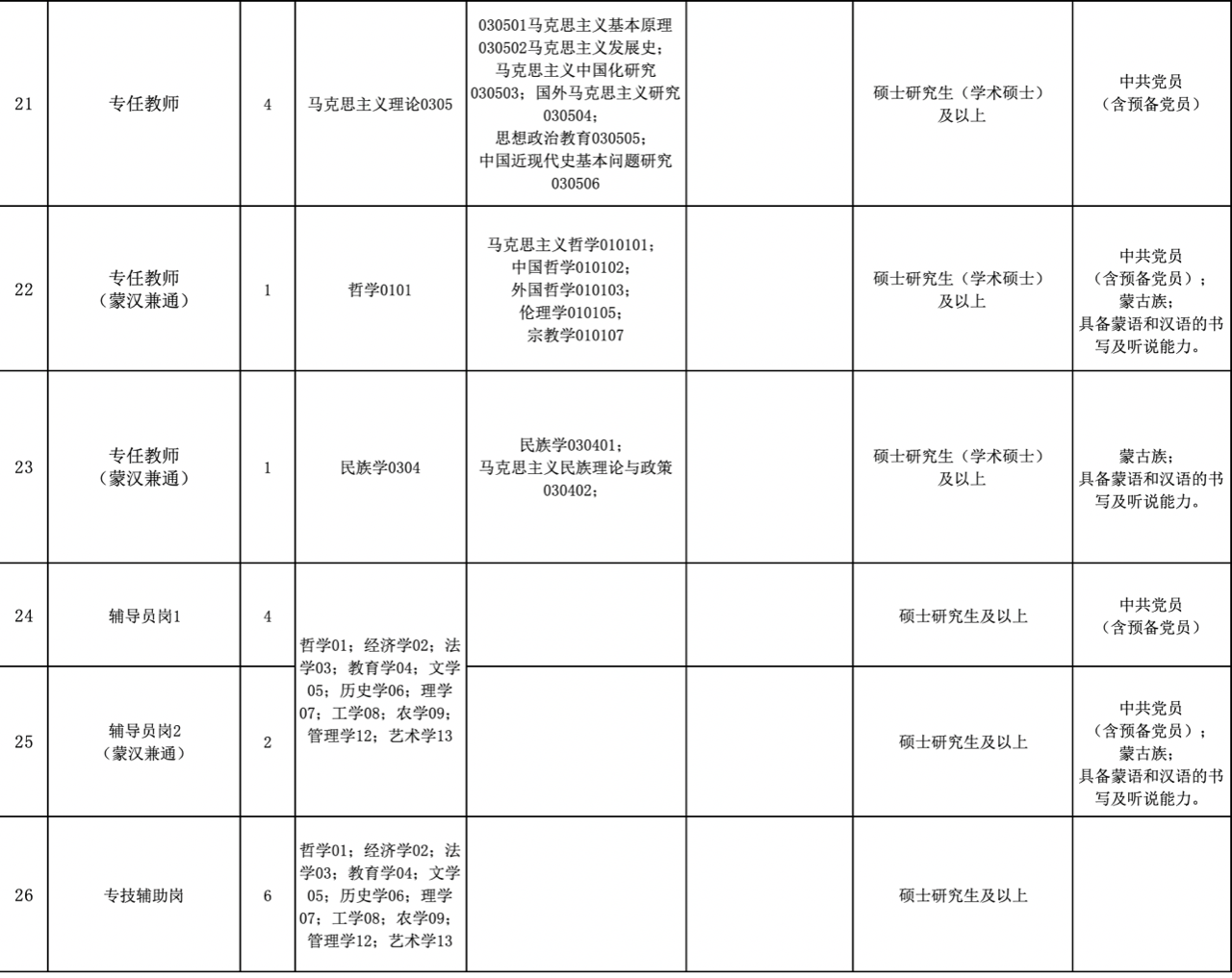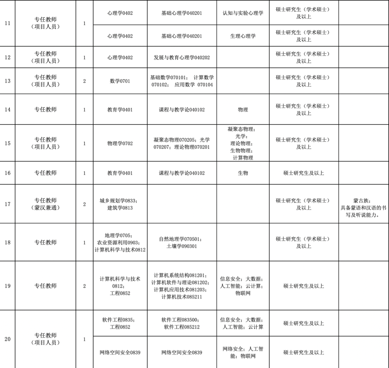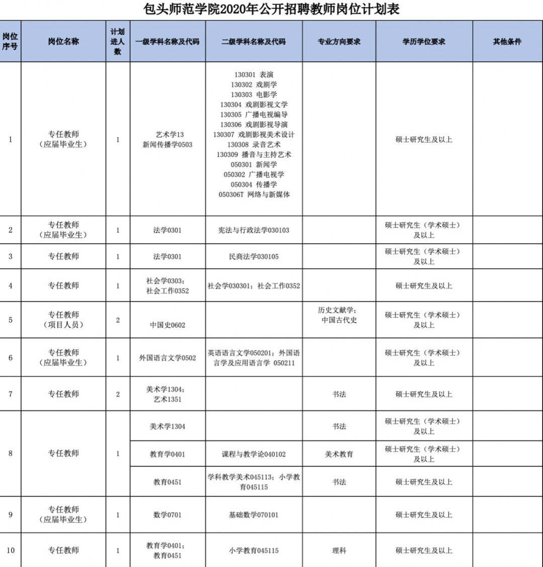 2020年公開招聘具有事業(yè)編制,碩士研究生學(xué)歷專任教師31人、專業(yè)技術(shù)輔助人員6人、輔導(dǎo)員6人,其中包含“蒙漢兼通”人員6人、高校畢業(yè)生服務(wù)基層項(xiàng)目人員和基層公益性崗位服務(wù)人員8人、應(yīng)屆高校畢業(yè)生4人。崗位、人數(shù)及崗位招聘具體條件詳見《包頭師范學(xué)院2020年公開招聘教師崗位計(jì)劃表》。