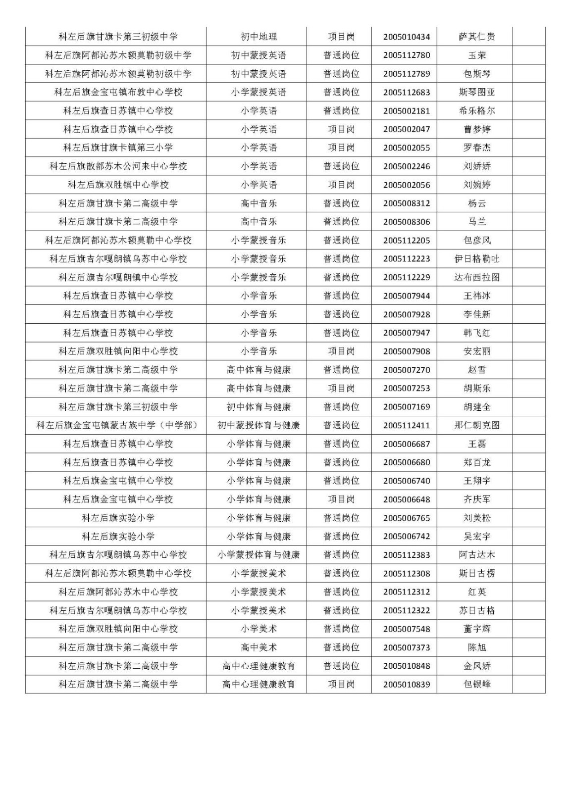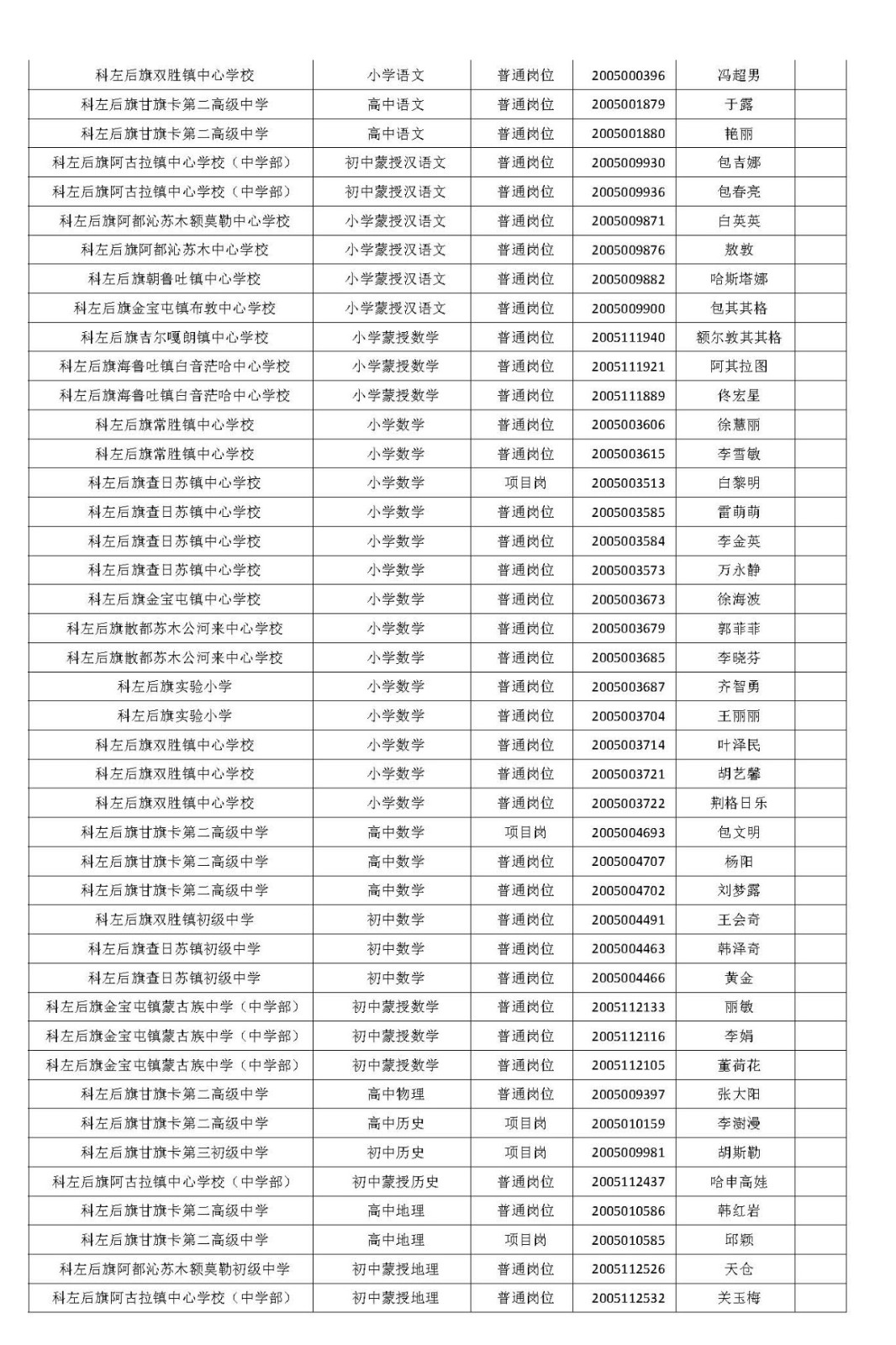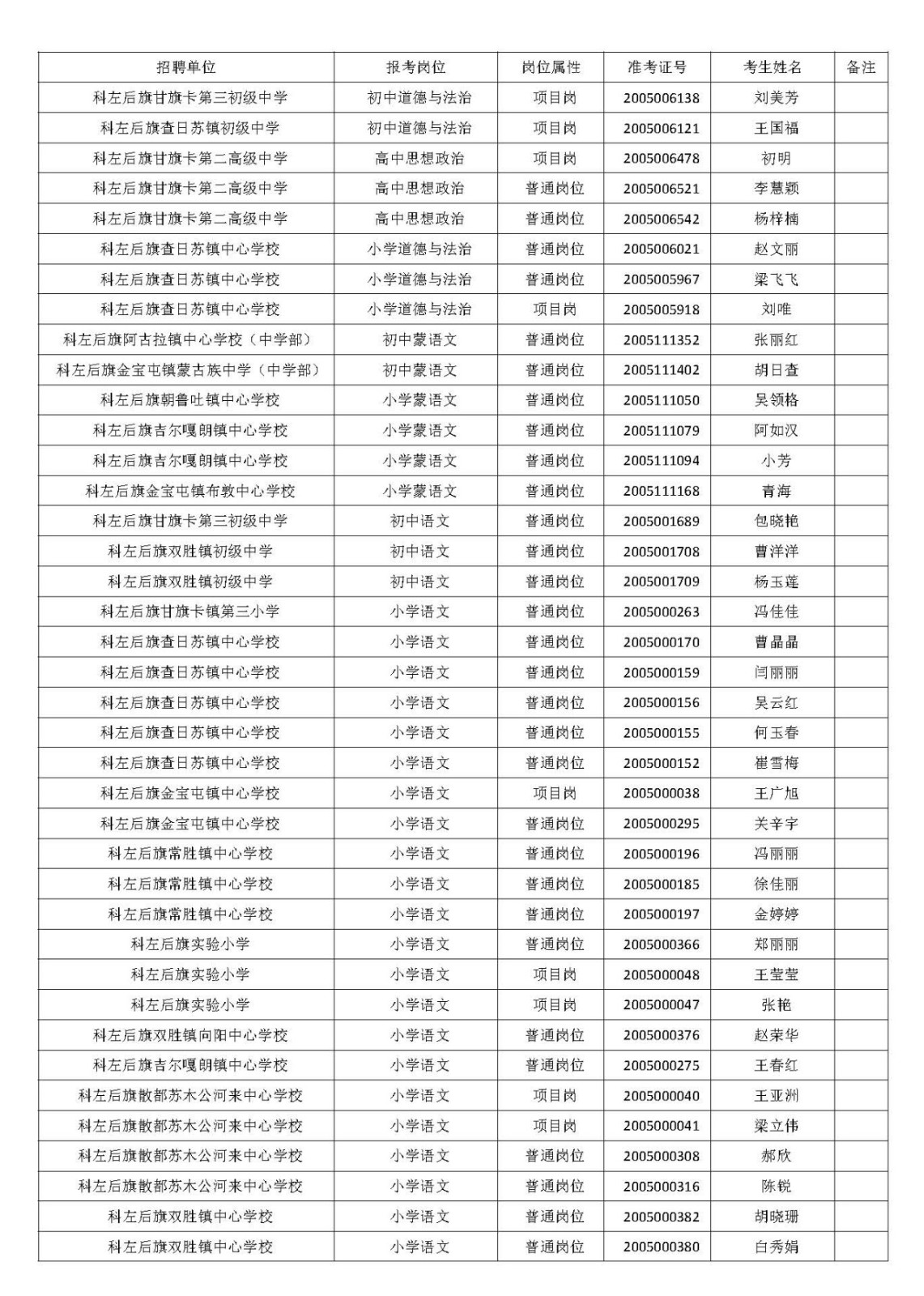 科左后旗崗位工作人員擬聘用人員名單