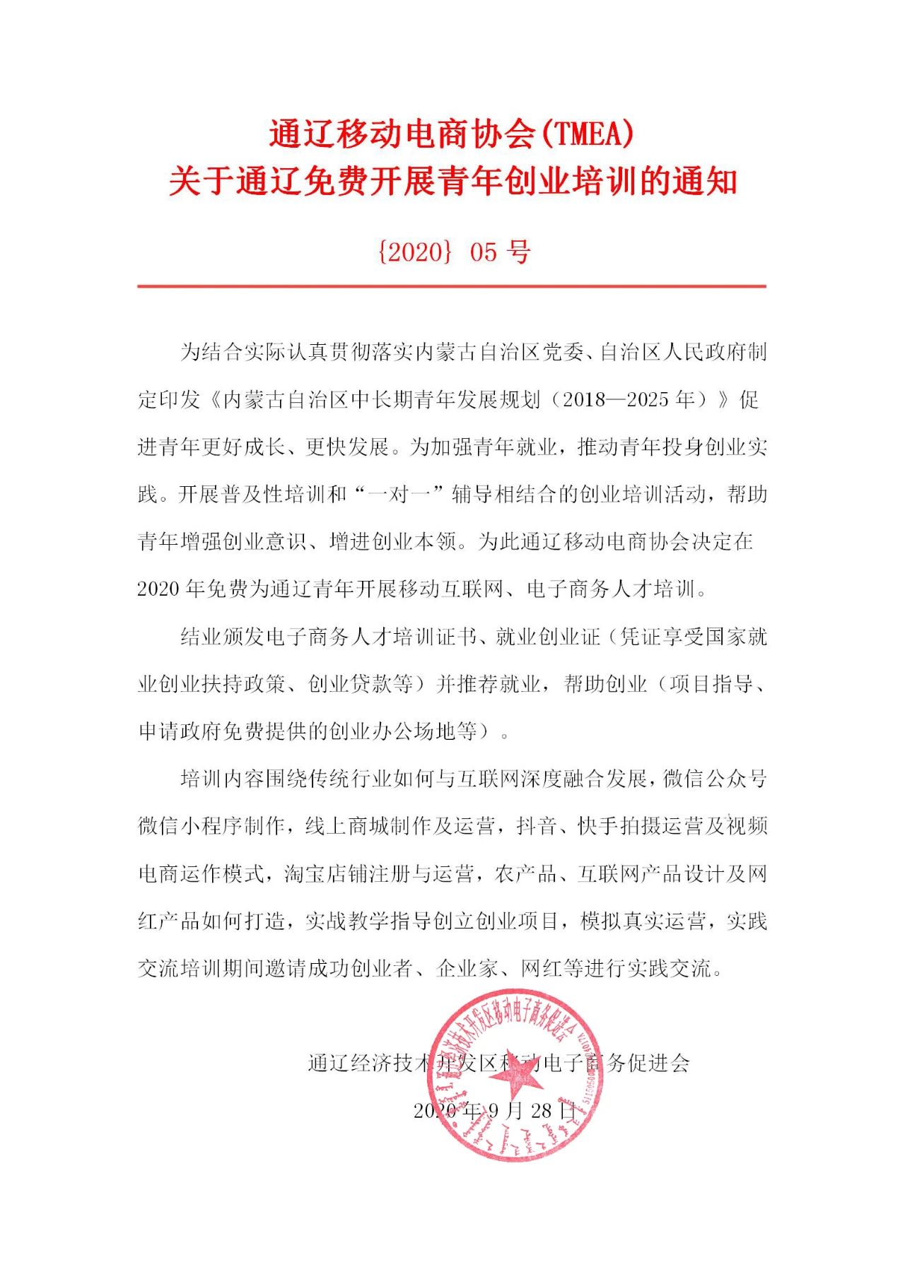 為結(jié)合實(shí)際認(rèn)真貫徹落實(shí)內(nèi)蒙古自治區(qū)黨委、自治區(qū)人民政府制定印發(fā)《內(nèi)蒙古自治區(qū)中長期青年發(fā)展規(guī)劃(2018—2025年)》促進(jìn)青年更好成長、更快發(fā)展。為加強(qiáng)青年就業(yè),推動(dòng)青年投身創(chuàng)業(yè)實(shí)踐。開展普及性培訓(xùn)和“一對一”輔導(dǎo)相結(jié)合的創(chuàng)業(yè)培訓(xùn)活動(dòng),幫助青年增強(qiáng)創(chuàng)業(yè)意識、增進(jìn)創(chuàng)業(yè)本領(lǐng)。為此通遼移動(dòng)電商協(xié)會(huì)決定在2020年免費(fèi)為通遼青年開展移動(dòng)互聯(lián)網(wǎng)、電子商務(wù)人才培訓(xùn)。
