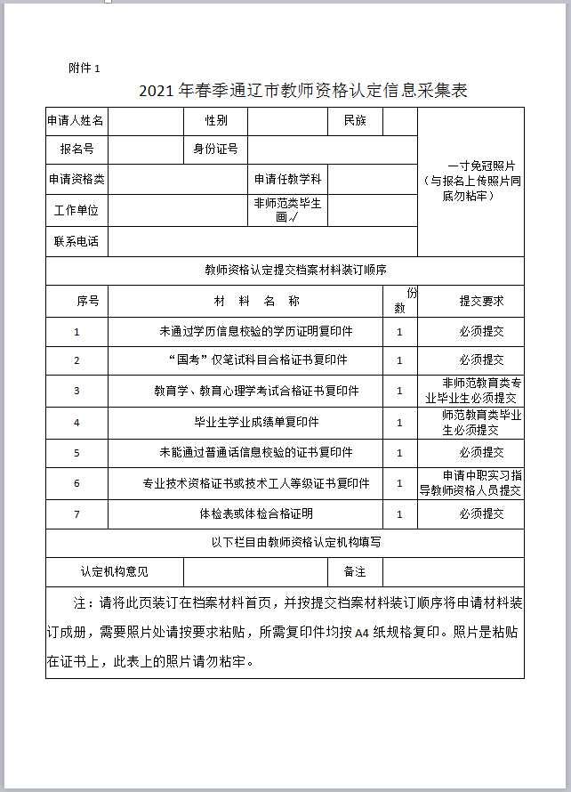 7.《2021年春季通遼市教師資格認(rèn)定信息采集表》一份,近期1寸免冠彩色白底照片1張(與報(bào)名上傳的照片和體檢表上的照片同底)(附件1)。