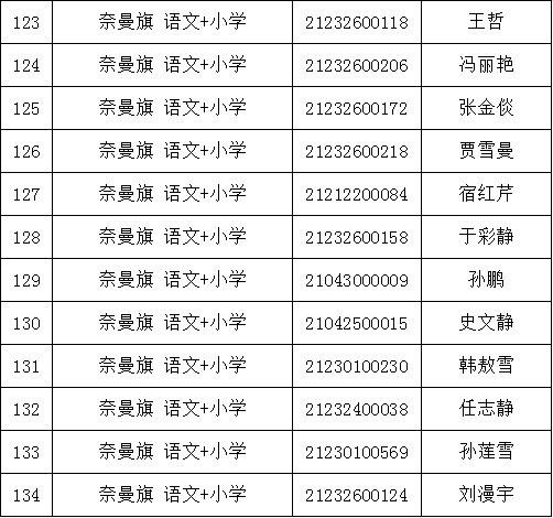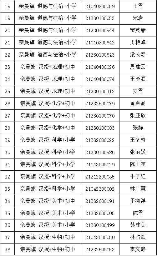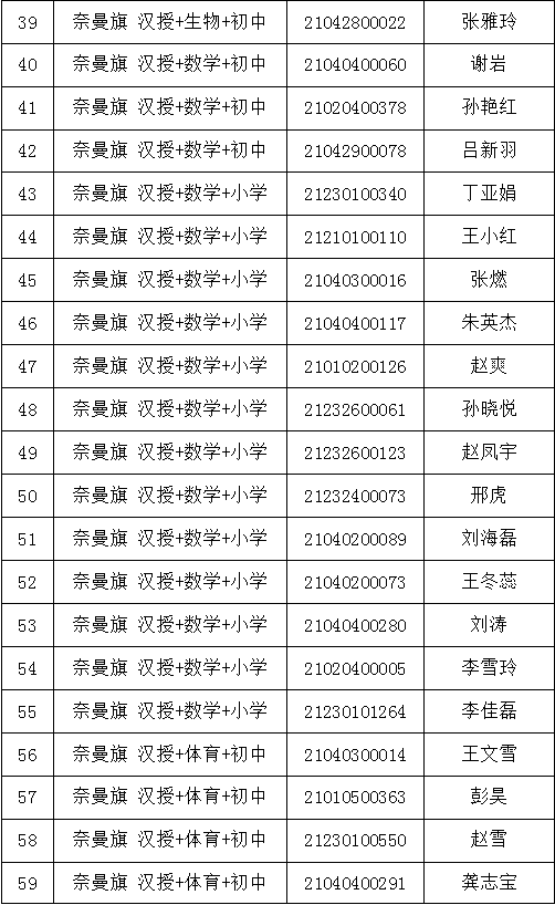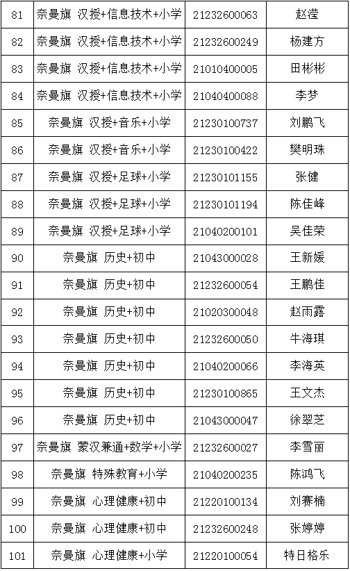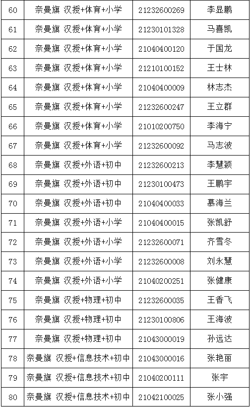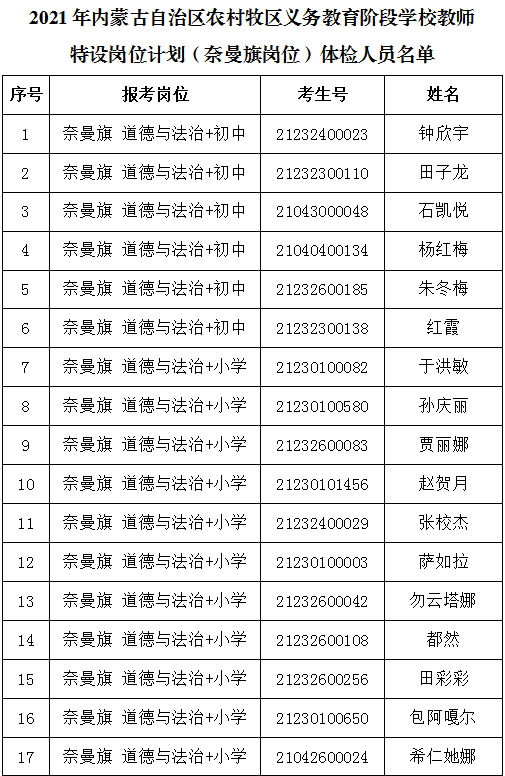 2.各項(xiàng)體檢報(bào)告單個(gè)人均不得帶走,由醫(yī)院統(tǒng)一收取。3.體檢項(xiàng)目和體檢標(biāo)準(zhǔn)參照公務(wù)員錄用體檢及教師資格證認(rèn)定體檢標(biāo)準(zhǔn)等有關(guān)規(guī)定執(zhí)行,具體請看蒙醫(yī)院體檢詳細(xì)說明。4.受檢人員在體檢過程中如弄虛作假或者隱瞞真實(shí)情況致使體檢結(jié)果失真的,取消聘用資格;患有不符合教育教學(xué)需求的其他疾病人員視為體檢不合格,取消聘用資格。5.考生要保持聯(lián)絡(luò)方式暢通,遇有特殊情況或手機(jī)號碼變動要及時(shí)撥打0475-4213633(奈曼旗教體局人事師資股)進(jìn)行聯(lián)系。(一)體檢人員要自覺遵守通遼市疫情防控有關(guān)規(guī)定,所有考生須通過全區(qū)一體化政府服務(wù)平臺“蒙速辦”APP或健康通遼服務(wù)公眾號、健康通遼APP申領(lǐng)“健康碼”。(二)考生應(yīng)成列排隊(duì),與他人保持一米以上安全距離,減少語言交流,有序進(jìn)入。要求全程佩戴醫(yī)用外科口罩,并進(jìn)行手部消毒。通過查驗(yàn)健康碼、行程碼且體溫測量合格(低于37.3℃)后方可進(jìn)行體檢。健康碼、行程碼或體溫異常的考生,應(yīng)當(dāng)服從現(xiàn)場防疫人員安排,配合做進(jìn)一步檢查和處置。(三)考生不得提供虛假身體健康狀況和證明,對隱瞞行程、隱瞞病情、故意壓制癥狀、瞞報(bào)漏報(bào)健康情況的人員追究相應(yīng)責(zé)任。附件:2021年內(nèi)蒙古自治區(qū)農(nóng)村牧區(qū)義務(wù)教育階段學(xué)校教師特設(shè)崗位計(jì)劃(奈曼旗崗位)體檢人員名單