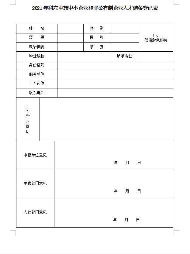 1.《2021年科左中旗中小企業(yè)和非公有制企業(yè)人才儲備登記表》(附件),一式兩份;