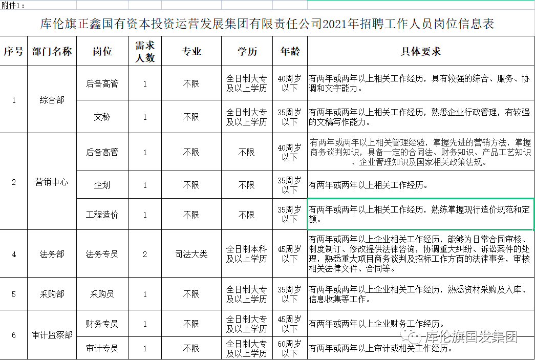 招聘崗位詳見(jiàn)《庫(kù)倫旗正鑫國(guó)有資本投資運(yùn)營(yíng)發(fā)展集團(tuán)有限責(zé)任公司2021年公開(kāi)招聘工作人員崗位信息一覽表》(附件1),應(yīng)聘人員每人限報(bào)一個(gè)崗位。