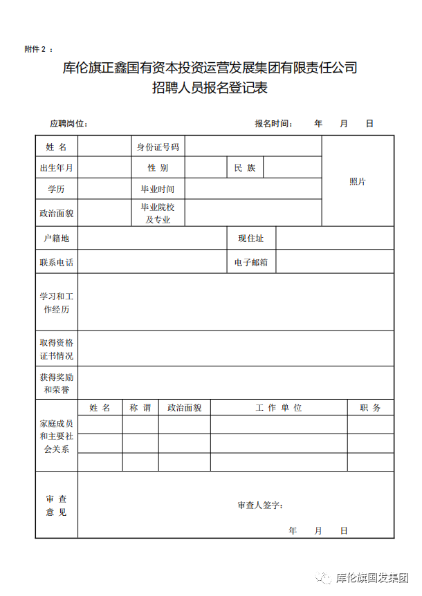 (1)填寫(xiě)《庫(kù)倫旗正鑫國(guó)有資本投資運(yùn)營(yíng)發(fā)展集團(tuán)有限責(zé)任公司招聘人員報(bào)名登記表》(附件2)2份;
