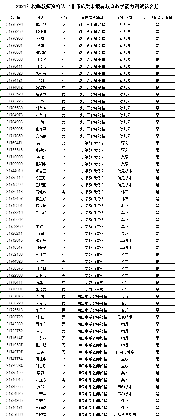 2.2021年秋季教師資格認(rèn)定非師范類申報(bào)者教育教學(xué)能力測(cè)試花名冊(cè)