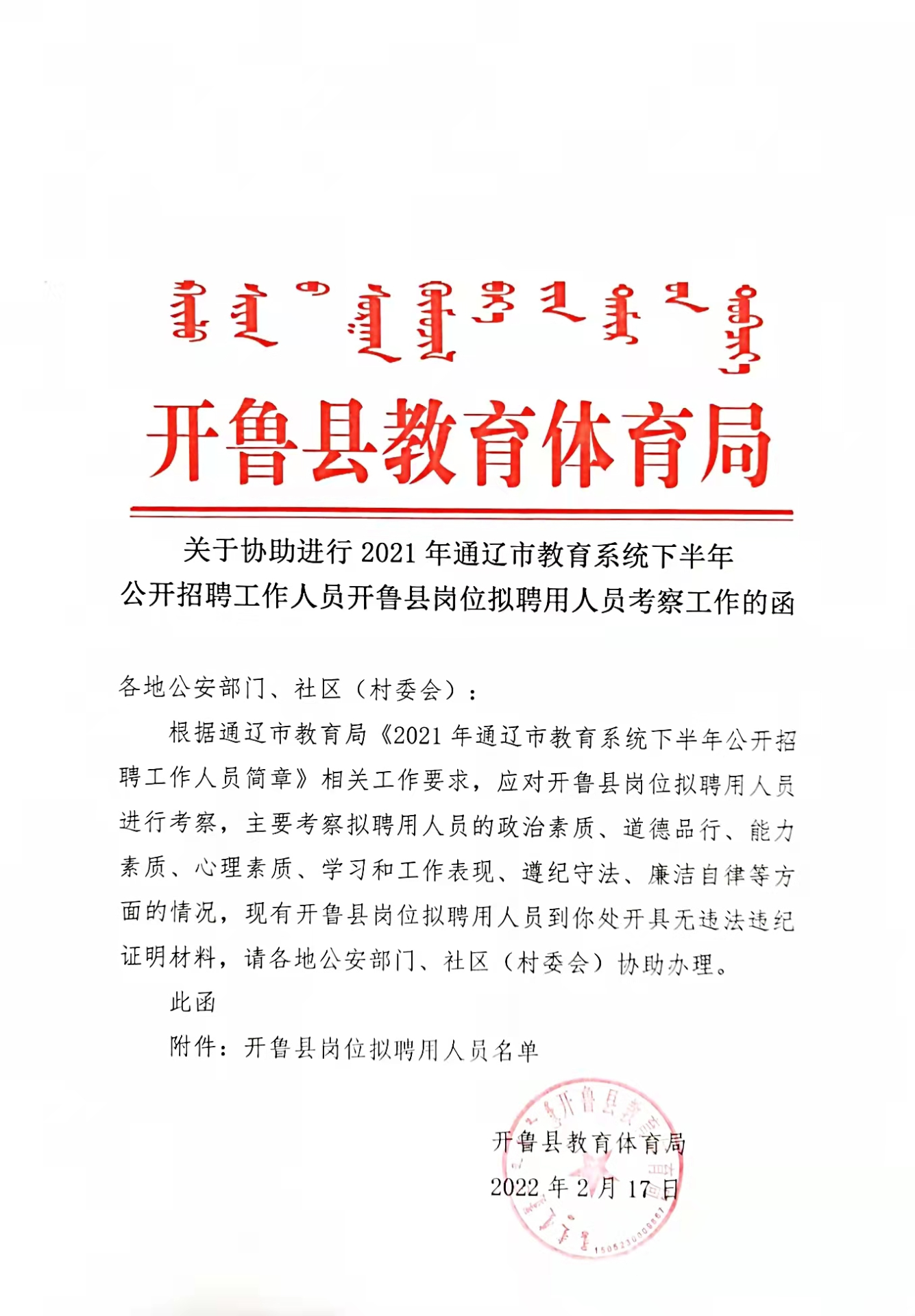 3.居住地所在社區(qū)(村委會(huì))、戶(hù)籍所在地或居住地轄區(qū)派出所出具的無(wú)違法違紀(jì)證明材料,出具部門(mén)填寫(xiě)意見(jiàn)并簽字蓋章。(請(qǐng)待考察人員下載《關(guān)于協(xié)助進(jìn)行2021年通遼市教育系統(tǒng)下半年公開(kāi)招聘工作人員開(kāi)魯縣崗位擬聘用人員考察工作的函》及《政審表》)