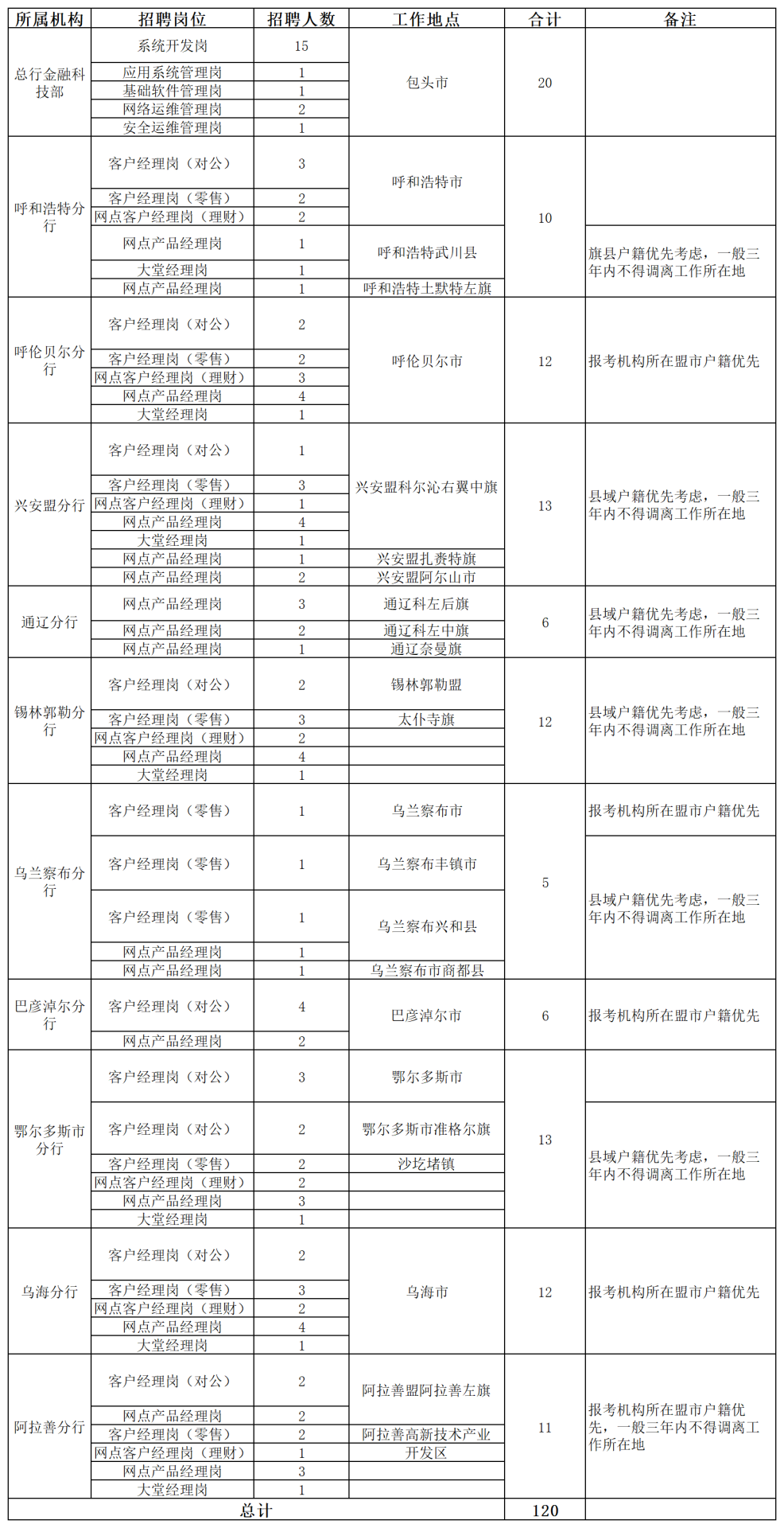分行:網(wǎng)點產(chǎn)品經(jīng)理崗39人、客戶經(jīng)理崗(對公)21人、客戶經(jīng)理崗(零售)20人、網(wǎng)點客戶經(jīng)理崗(理財經(jīng)理)13人、大堂經(jīng)理崗7人,共100人。