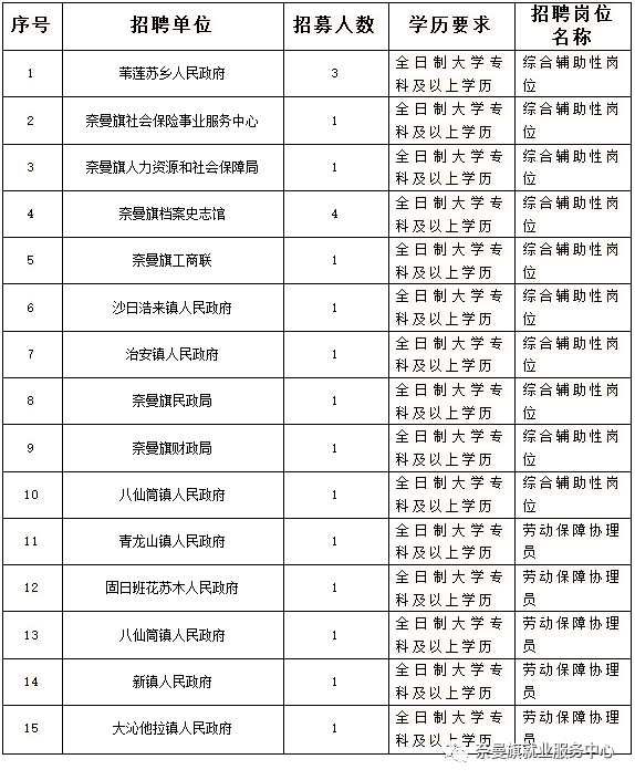(一)離校兩年及兩年以上從未就業(yè)高校畢業(yè)生:從未就業(yè)指從未在市場監(jiān)督管理部門領(lǐng)取營業(yè)執(zhí)照或在公司等實(shí)體中擔(dān)任股東等職務(wù)、從未在民政部門辦理民辦非企業(yè)登記證、從未在勞動(dòng)就業(yè)子系統(tǒng)中進(jìn)行過就業(yè)登記、從未繳納過城鎮(zhèn)職工基本養(yǎng)老保險(xiǎn)。(二)持有《中華人民共和國殘疾人證》的殘疾高校畢業(yè)生。(三)正在享受最低生活保障待遇期間,且連續(xù)失業(yè)登記1年以上女滿35周歲、男滿45周歲的失業(yè)高校畢業(yè)生。(一)報(bào)名者應(yīng)具備以下資格條件1.擁護(hù)中華人民共和國憲法,擁護(hù)中國共產(chǎn)黨領(lǐng)導(dǎo)和社會(huì)主義制度;3.具有正常履行職責(zé)的身體條件和心理素質(zhì);(二)每位報(bào)名者只能應(yīng)聘一個(gè)職位,報(bào)名者填寫學(xué)歷、學(xué)位時(shí),要填寫全日制學(xué)歷、學(xué)位。填寫所學(xué)專業(yè)時(shí),要嚴(yán)格按照本人畢業(yè)證書上的專業(yè)名稱填寫,并確保所填專業(yè)符合應(yīng)聘崗位專業(yè)要求。(三)離校2年及以上從未就業(yè)的就業(yè)困難高校畢業(yè)生畢業(yè)證書取得時(shí)間須在2020年7月31日前。在讀普通高校全日制專科生、本科生、研究生不得報(bào)名。(一)報(bào)名及資格初審時(shí)間:即日起至2022年8月29日17:30(節(jié)假日休息)(二)資格初審:奈曼旗人力資源和就業(yè)服務(wù)中心對(duì)報(bào)名的應(yīng)聘人員進(jìn)行資格初審,現(xiàn)場通過勞動(dòng)就業(yè)核心業(yè)務(wù)經(jīng)辦子系統(tǒng)和“內(nèi)蒙古自治區(qū)社會(huì)保險(xiǎn)管理信息系統(tǒng)”對(duì)報(bào)名的應(yīng)聘人員學(xué)歷情況、畢業(yè)證信息、就業(yè)失業(yè)狀態(tài)以及是否享受就業(yè)困難人員援助政策(包括社會(huì)保險(xiǎn)補(bǔ)貼和公益性崗位補(bǔ)貼)、參加工傷或者失業(yè)保險(xiǎn)、領(lǐng)取營業(yè)執(zhí)照或民辦非企業(yè)單位證書等情況進(jìn)行精準(zhǔn)核查。1.自行打印報(bào)名表(見附件),一式一份。2.本人身份證、戶口本、畢業(yè)證書原件及復(fù)印件,本人近期免冠二寸照片兩張。3.提供在奈曼旗城鎮(zhèn)居住6個(gè)月(含)以上證明材料。4.殘疾高校畢業(yè)生需提供《中華人民共和國殘疾人證》。5.享受低保的長期失業(yè)高校畢業(yè)生需提供低保證明材料和失業(yè)登記證明材料。資格初審合格后的報(bào)名人員統(tǒng)一進(jìn)行失業(yè)登記和就業(yè)困難人員認(rèn)定(已進(jìn)行失業(yè)登記和就業(yè)困難人員認(rèn)定的除外)。逾期未進(jìn)行就業(yè)困難人員認(rèn)定的,視同放棄聘用資格。常住社區(qū)按照《內(nèi)蒙古自治區(qū)就業(yè)困難人員認(rèn)定辦法的通知》給予就業(yè)困難人員認(rèn)定,對(duì)未能認(rèn)定就業(yè)困難人員的,取消報(bào)名資格。奈曼旗人力資源和就業(yè)服務(wù)中心將符合條件人員材料交由用人單位,用人單位對(duì)符合條件人員進(jìn)行資格審核,達(dá)到標(biāo)準(zhǔn)雙向選擇,達(dá)成意向后確定擬用人選。選崗現(xiàn)場,應(yīng)聘人員現(xiàn)場領(lǐng)取選崗確認(rèn)書,并在選崗確認(rèn)書上簽字。因應(yīng)聘人員自身原因未在規(guī)定時(shí)間內(nèi)進(jìn)行選崗的,視為放棄選崗資格。自愿放棄選崗資格的,現(xiàn)場簽署放棄選崗資格聲明。最終選用上崗人員由用人單位確定,最終解釋權(quán)歸用人單位所有。 為提高擬聘用人員的技能水平,使其盡早適應(yīng)崗位要求,本次招聘將集中開展崗前培訓(xùn)。就業(yè)困難人員認(rèn)定結(jié)束后,擬聘用人員需持《就業(yè)創(chuàng)業(yè)證》到定點(diǎn)培訓(xùn)機(jī)構(gòu)報(bào)到參加培訓(xùn),培訓(xùn)期間不得遲到、早退、請(qǐng)假、曠課。未按規(guī)定要求參加培訓(xùn)的、崗前培訓(xùn)不及格的、培訓(xùn)結(jié)業(yè)考試不及格的,取消聘用資格。培訓(xùn)時(shí)間、地點(diǎn):另行通知通過就業(yè)困難人員認(rèn)定的擬聘用人員在奈曼旗人力資源和就業(yè)服務(wù)中心微信公眾號(hào)上進(jìn)行公示,公示期為5個(gè)工作日。(一)公示期滿,沒有問題或者反映問題不影響聘用的,用人單位與其簽訂公益性崗位勞動(dòng)合同,公益性崗位合同期限為3年。對(duì)反映問題嚴(yán)重并查有實(shí)據(jù)的,取消聘用資格。(二)公益性崗位人員薪酬待遇標(biāo)準(zhǔn)不低于奈曼旗最低工資標(biāo)準(zhǔn),用人單位給予的實(shí)際薪酬待遇以公益性崗位合同約定為準(zhǔn)。用人單位為公益性崗位人員依法繳納社會(huì)保險(xiǎn)。(三)非因用人單位原因,擬聘用人員未在規(guī)定時(shí)間內(nèi)與用人單位簽訂公益性崗位勞動(dòng)合同的,取消聘用資格。應(yīng)聘人員在招聘工作期間要隨時(shí)關(guān)注奈曼旗人力資源和就業(yè)服務(wù)中心公眾號(hào)并保持電話通訊暢通。因個(gè)人原因造成的信息接收溝通不暢而影響資格審查或聘用的,責(zé)任自行承擔(dān)。應(yīng)聘人員資格審查工作貫穿于招聘工作全過程,招聘工作過程中及上崗后發(fā)現(xiàn)不符合聘用條件的,取消其公益性崗位援助資格,已享受公益性崗位援助補(bǔ)貼資金的,追回其已享受的各項(xiàng)補(bǔ)貼資金。公益