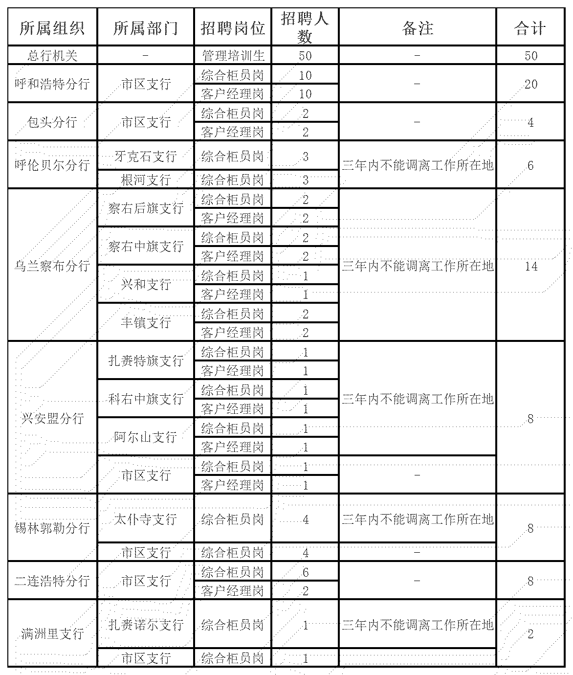 管理培訓(xùn)生50人,客戶(hù)經(jīng)理、綜合柜員70人,共120人。具體招聘崗位及工作地點(diǎn)見(jiàn)下表。