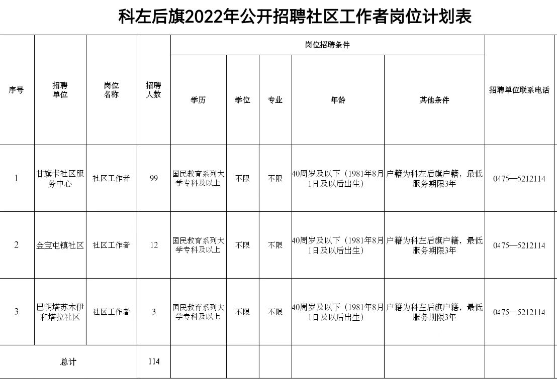 計(jì)劃招聘社區(qū)工作者114名。其中,甘旗卡社區(qū)服務(wù)中心99人、金寶屯鎮(zhèn)社區(qū)12人,巴胡塔蘇木伊和塔拉社區(qū)3人。詳見《科左后旗2022年公開招聘社區(qū)工作者崗位計(jì)劃表》。