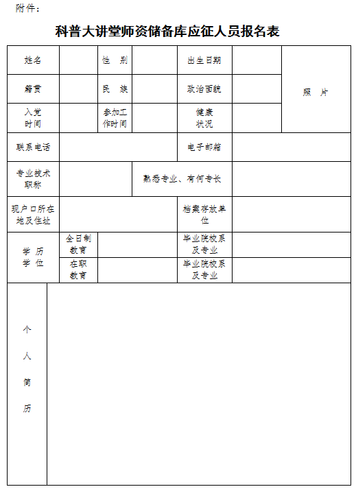 附件:科普大講堂師資儲(chǔ)備庫應(yīng)征人員報(bào)名表