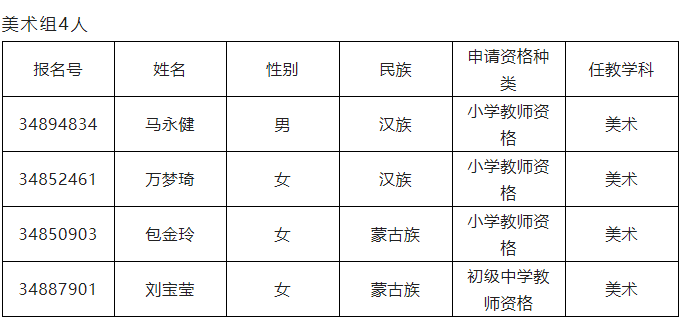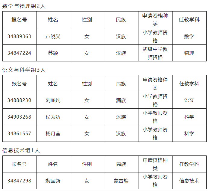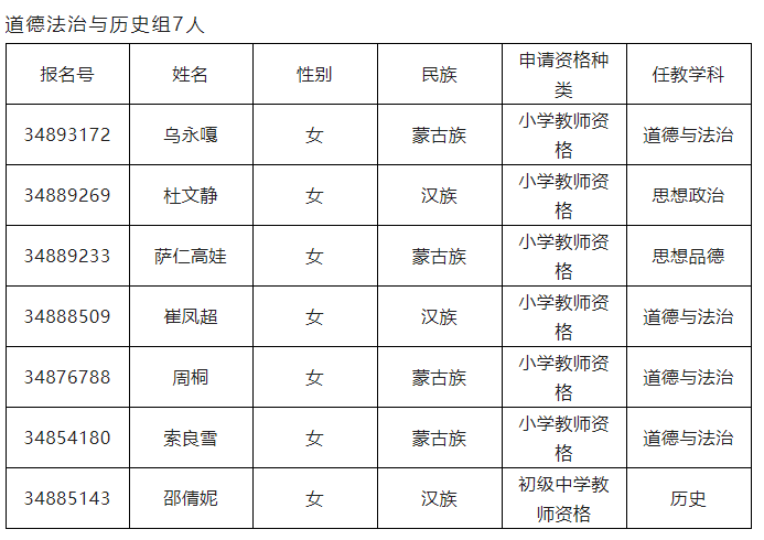 小 學(xué):人教版六年級(jí)下冊(cè)初級(jí)中學(xué):人教版九年級(jí)上冊(cè)2022年下半年奈曼旗教師資格認(rèn)定非師范類(lèi)申請(qǐng)人員教育教學(xué)能力測(cè)試人員名單