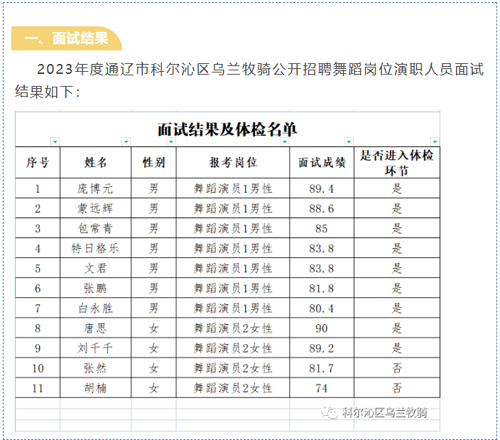 2023年度通遼市科爾沁區(qū)烏蘭牧騎公開(kāi)招聘舞蹈崗位演職人員面試結(jié)果如下: