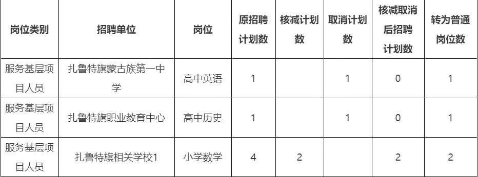 2023年扎魯特旗教育系統(tǒng)事業(yè)單位公開(kāi)招聘第一階段報(bào)名已經(jīng)結(jié)束。根據(jù)《2023年度扎魯特旗教育系統(tǒng)事業(yè)單位公開(kāi)招聘工作人員公告》有關(guān)內(nèi)容,對(duì)未達(dá)到開(kāi)考比例的“服務(wù)基層項(xiàng)目人員”崗位予以核減取消并轉(zhuǎn)為普通崗位(相關(guān)崗位被取消且已繳費(fèi)的應(yīng)聘人員,報(bào)考費(fèi)退還,若二次報(bào)名需重新繳費(fèi)),核減取消情況如下。