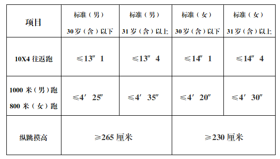 體能測評內(nèi)容包括10米×4往返跑、1000米跑(男)、800米跑(女)、縱跳摸高。體能測評不計成績,達到“合格”標準人員按時到指定地點參加面試,面試相關(guān)事宜另行公告。