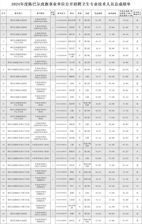 根據(jù)《內(nèi)蒙古自治區(qū)2024年度事業(yè)單位公開招聘工作人員公告》有關(guān)要求,現(xiàn)將2024年度陳巴爾虎旗事業(yè)單位公開招聘衛(wèi)生專業(yè)技術(shù)人員考試總成績公布如下: