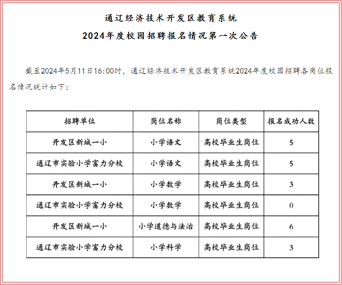 截至2024年5月11日16:00時,通遼經(jīng)濟(jì)技術(shù)開發(fā)區(qū)教育系統(tǒng)2024年度校園招聘各崗位報名情況統(tǒng)計如下: